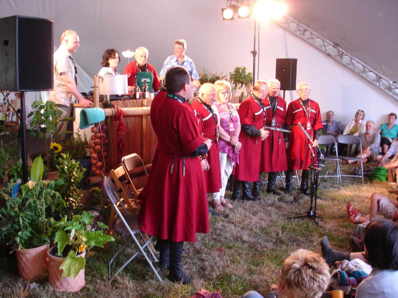 IADONI (canary, in Georgian) a well known Georgian choir not only sang but cooked in Womad’s fantastic Taste the World tent on Sunday 28th July. The singers, all from Guria province, are mostly quite aged now, and this was the first time any of them had ever been out of Georgia! They were brought over by the Art Gene Group NGO “Union of Art Gene”, whose main aim is to promote Georgia’s traditional folk culture www.artgeni.ge.